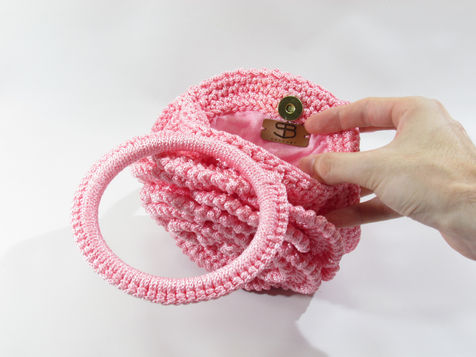 Bolsa em fio náutico com crochet em padrão de rosa e alça rígida revestida em crochet. Totalmente feita à mão.